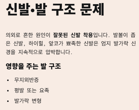 의외로 흔한 원인이 잘못된 신발 착용입니다. 발볼이 좁은 신발, 하이힐, 앞코가 뾰족한 신발은 엄지 발가락 신경을 지속적으로 압박합니다.