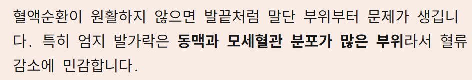 혈액순환이 원활하지 않으면 발끝처럼 말단 부위부터 문제가 생깁니다. 특히 엄지 발가락은 동맥과 모세혈관 분포가 많은 부위라서 혈류 감소에 민감합니다.