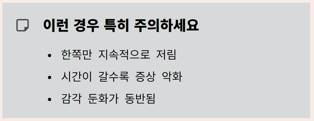 이 경우 특징은 저림이 반복적으로 나타나고, 자세를 바꾸면 심해지거나 완화된다는 점입니다. 아침보다 저녁에 더 심해지는 경우도 많습니다.