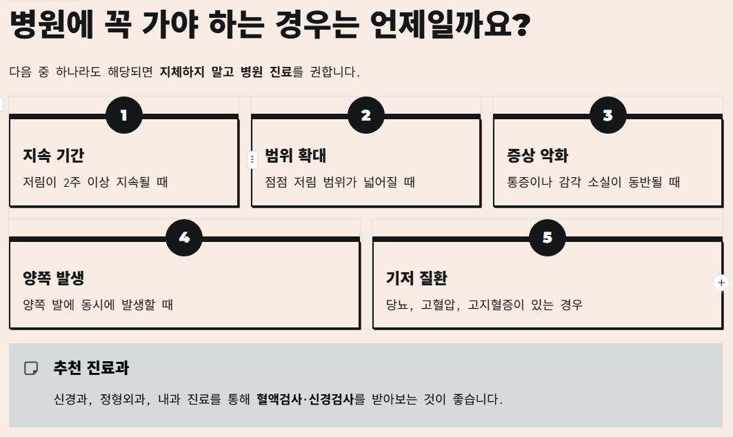 이때는 저림과 함께 발이 차갑다, 색이 창백하거나 보라빛으로 변한다, 걷다가 다리가 쉽게 피곤해진다 같은 증상이 동반될 수 있습니다.