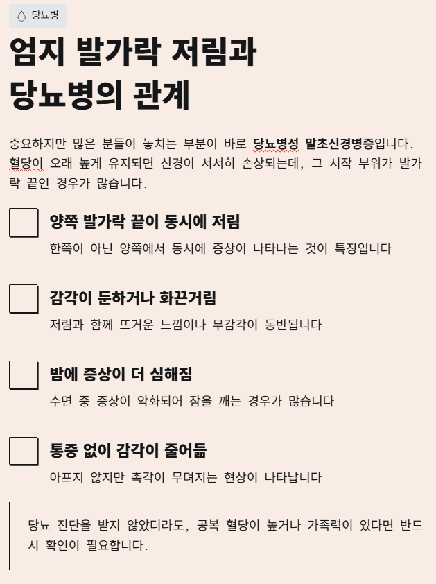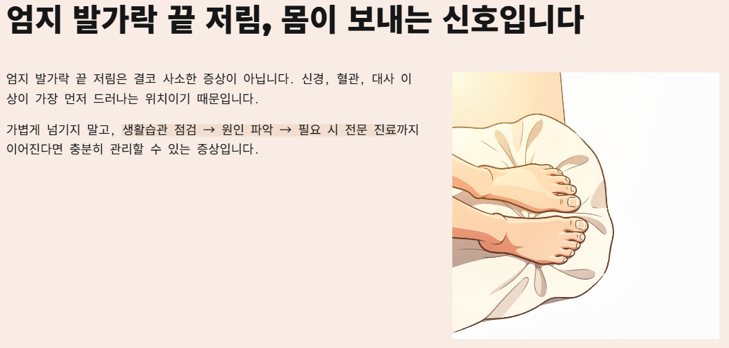 엄지 발가락 끝 저림은 결코 사소한 증상이 아닙니다. 신경, 혈관, 대사 이상이 가장 먼저 드러나는 위치이기 때문입니다. 가볍게 넘기지 말고, 생활습관 점검 → 원인 파악 → 필요 시 전문 진료까지 이어진다면 충분히 관리할 수 있는 증상입니다. 지금 이 글을 읽고 “나도 해당되는 것 같다”는 생각이 들었다면, 그 자체가 이미 몸의 신호를 잘 받아들인 것입니다.