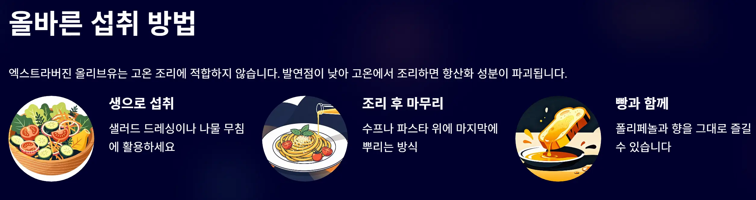 엑스트라버진 올리브유는 고온 조리에는 적합하지 않은 식품 재료입니다. 발연점이 낮아 고온에서 튀기거나 볶음 경우 항산화 성분이 파괴됩니다. 가장 이상적인인 섭취 방법은 생으로 섭취하거나, 조리 후 마무리 단계에 사용하는 것 입니다.