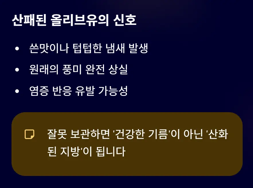 엑스트라버진 올리브유의 가장 큰 적은 산소, 빛, 열입니다. 이 3가지에 노출이 많이 되면 산화가 진행되면서 특유의 향과 맛이 변하고, 항산화 성분이 급격히 감소합니다. 이미 산패가 진행된 올리브유는 쓴맛이나 텁텁한 냄새가 나며, 장기적으로는 염증 반응을 유발할 가능성도 있습니다.